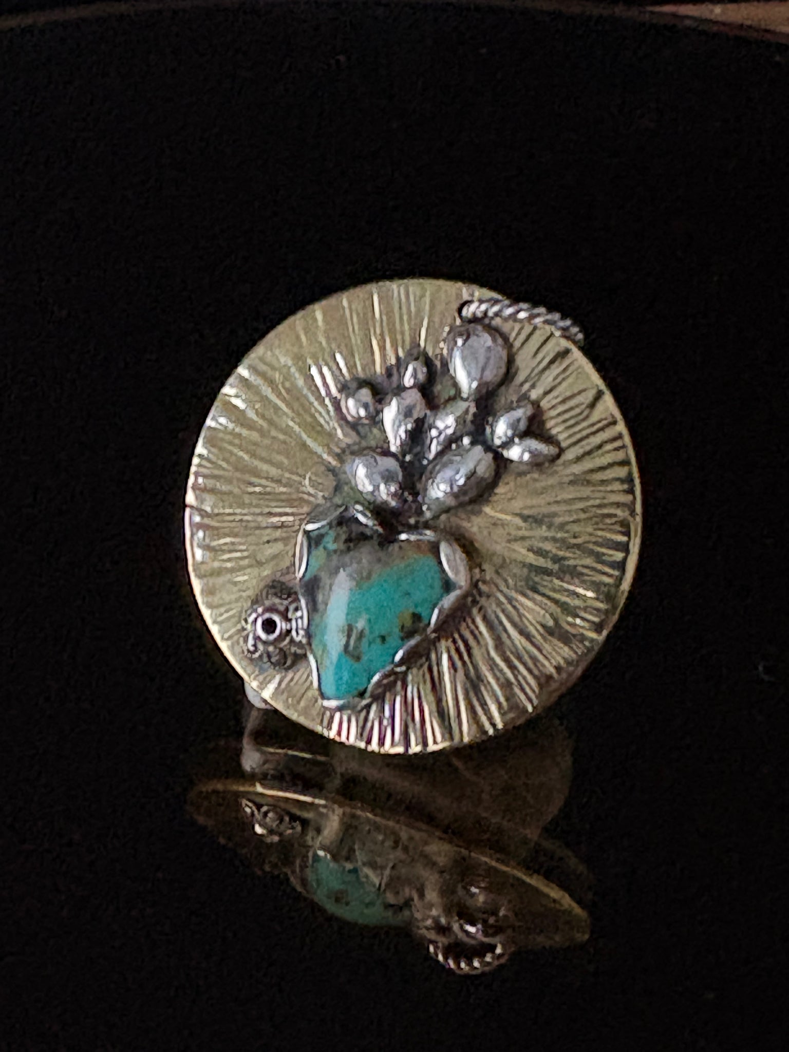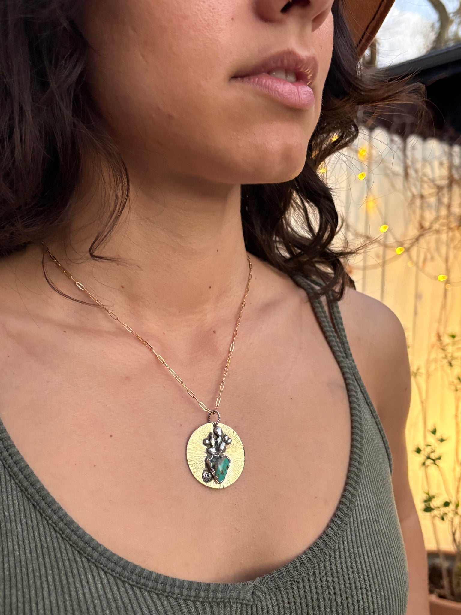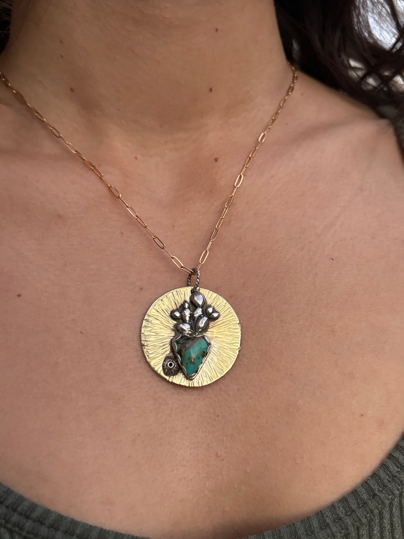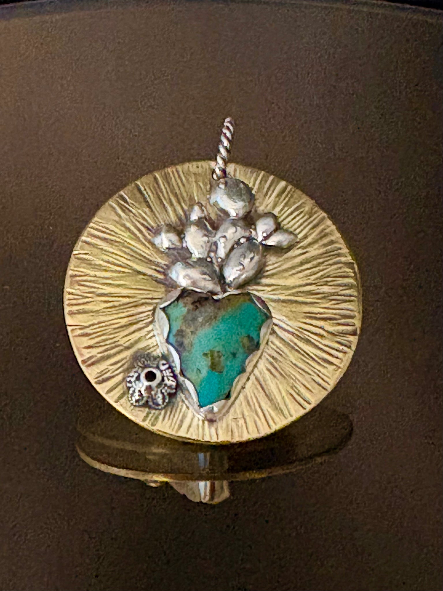 Brass Medallion featuring a turquoise heart and a silver cactus You can choose the medallion alone with no chain. Or you can purchase the medallion with the 14k gold filled 16' chain.