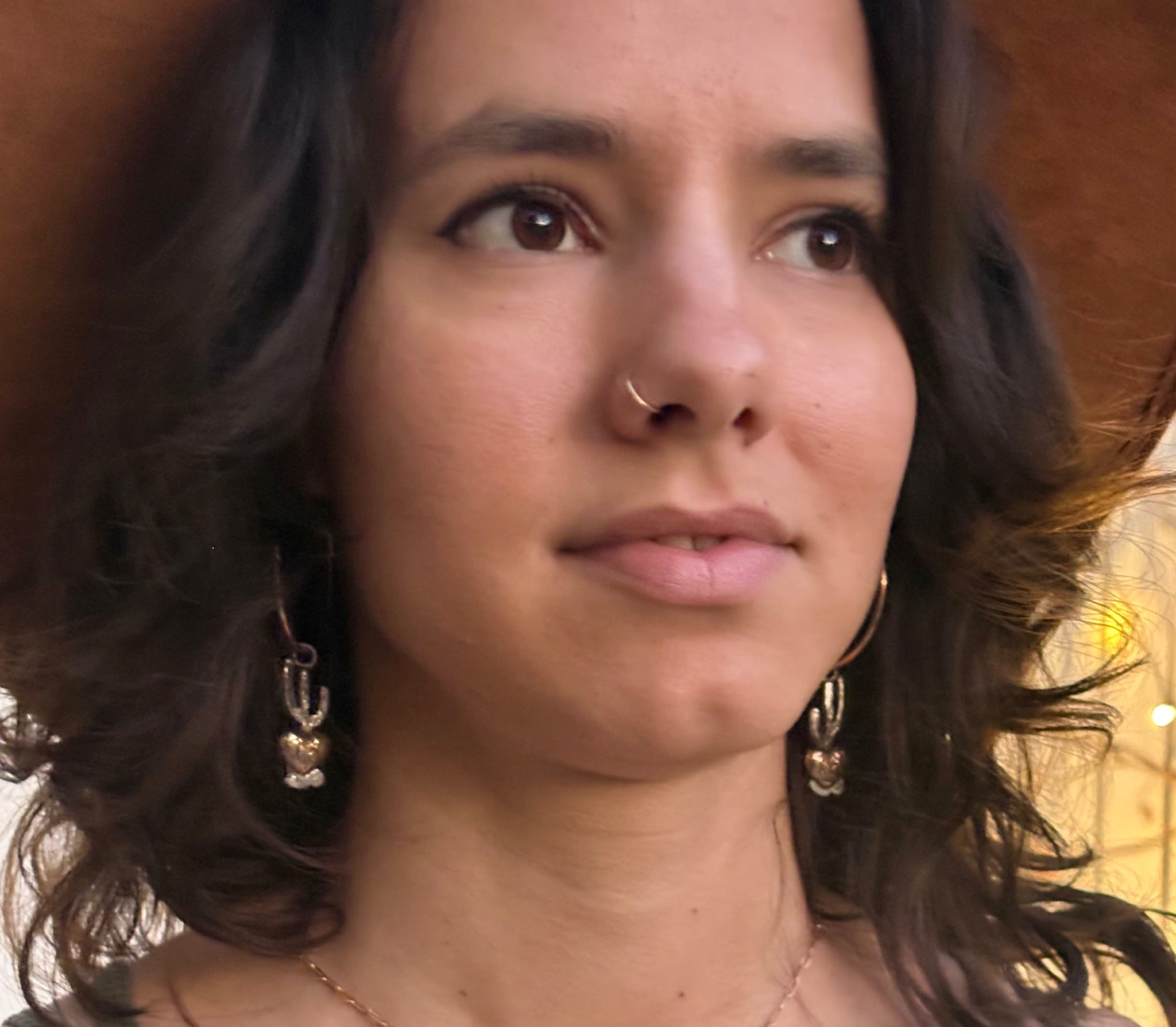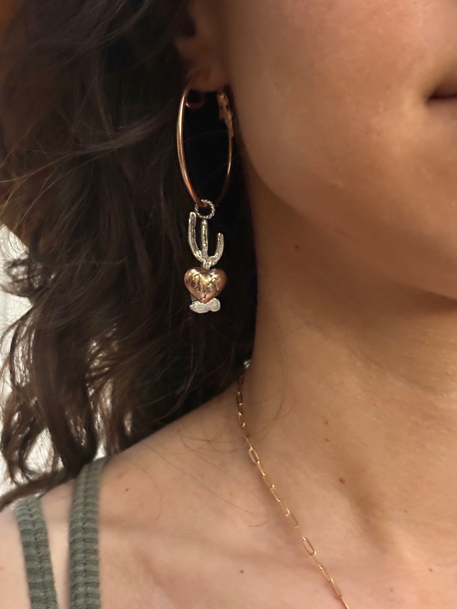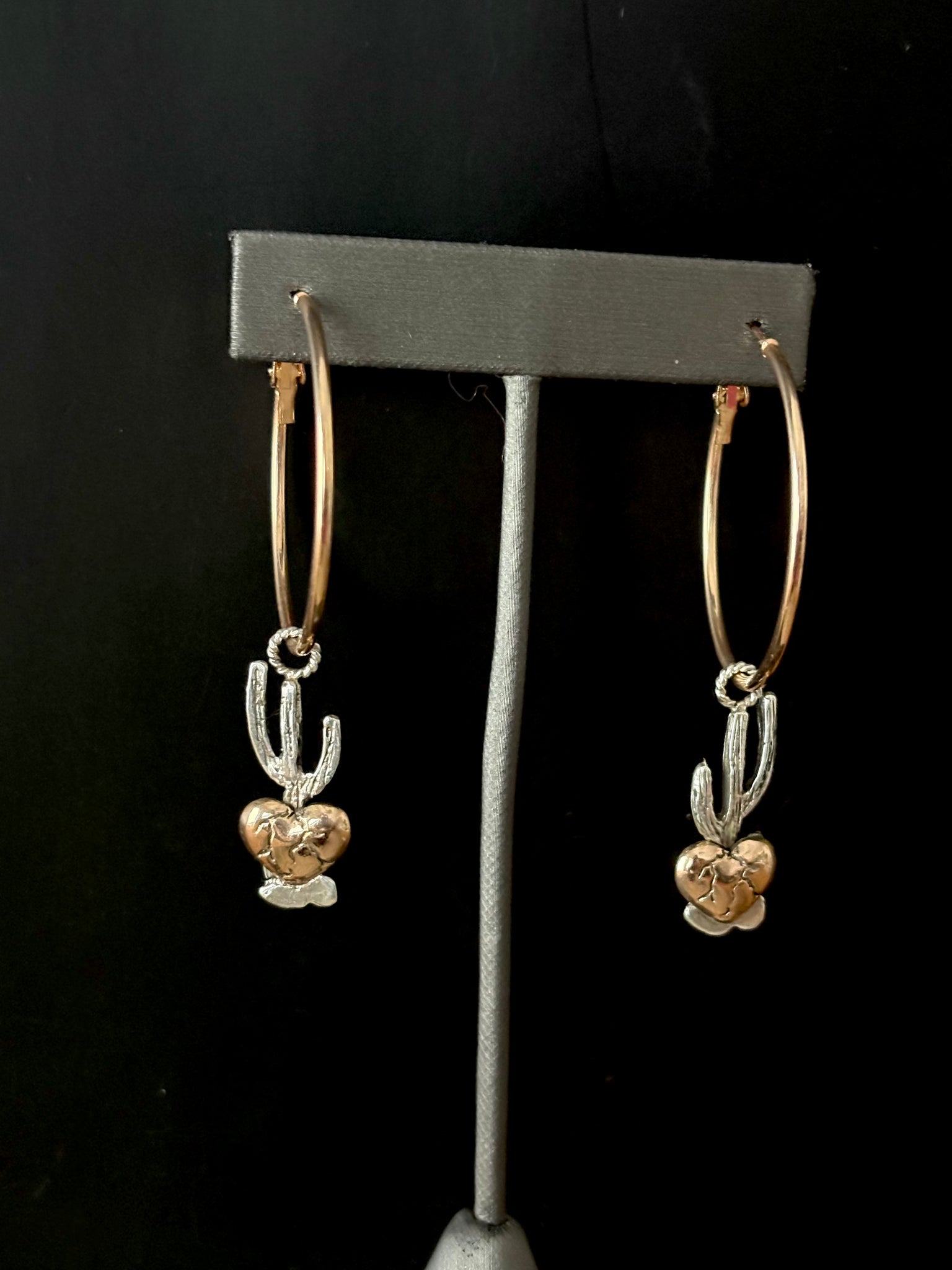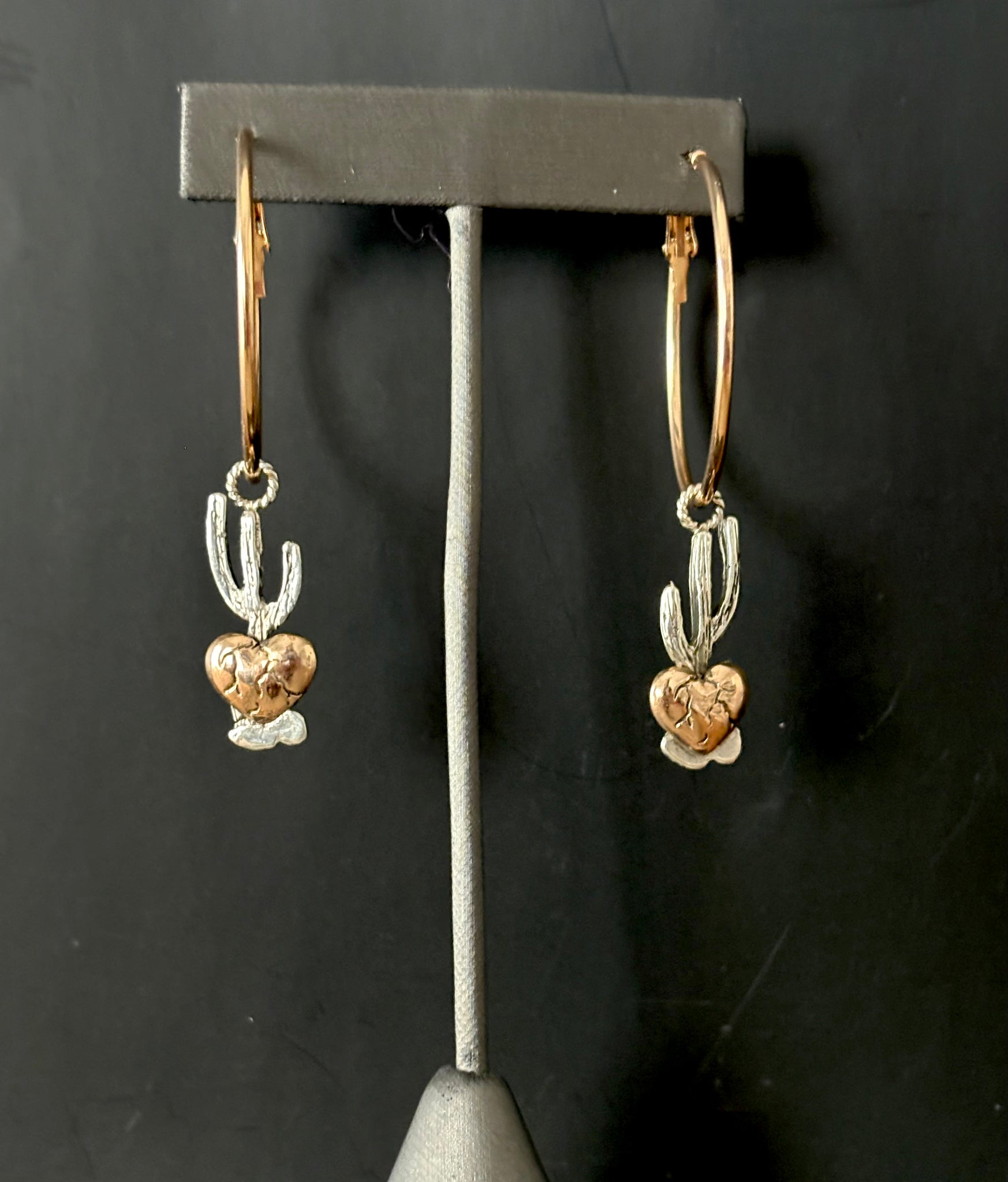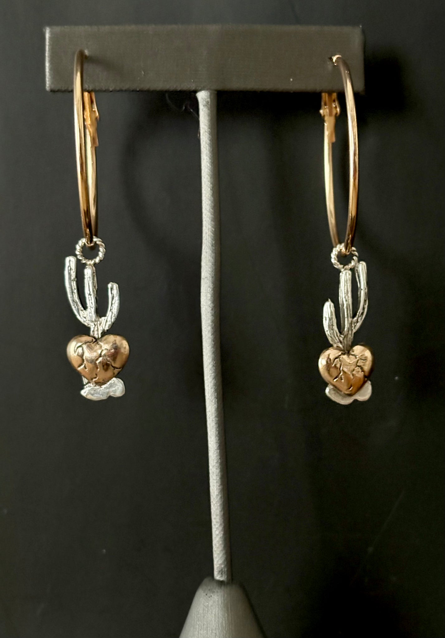 Hand crafted sterling silver saguaros with bronze rooted hearts and brass hoops