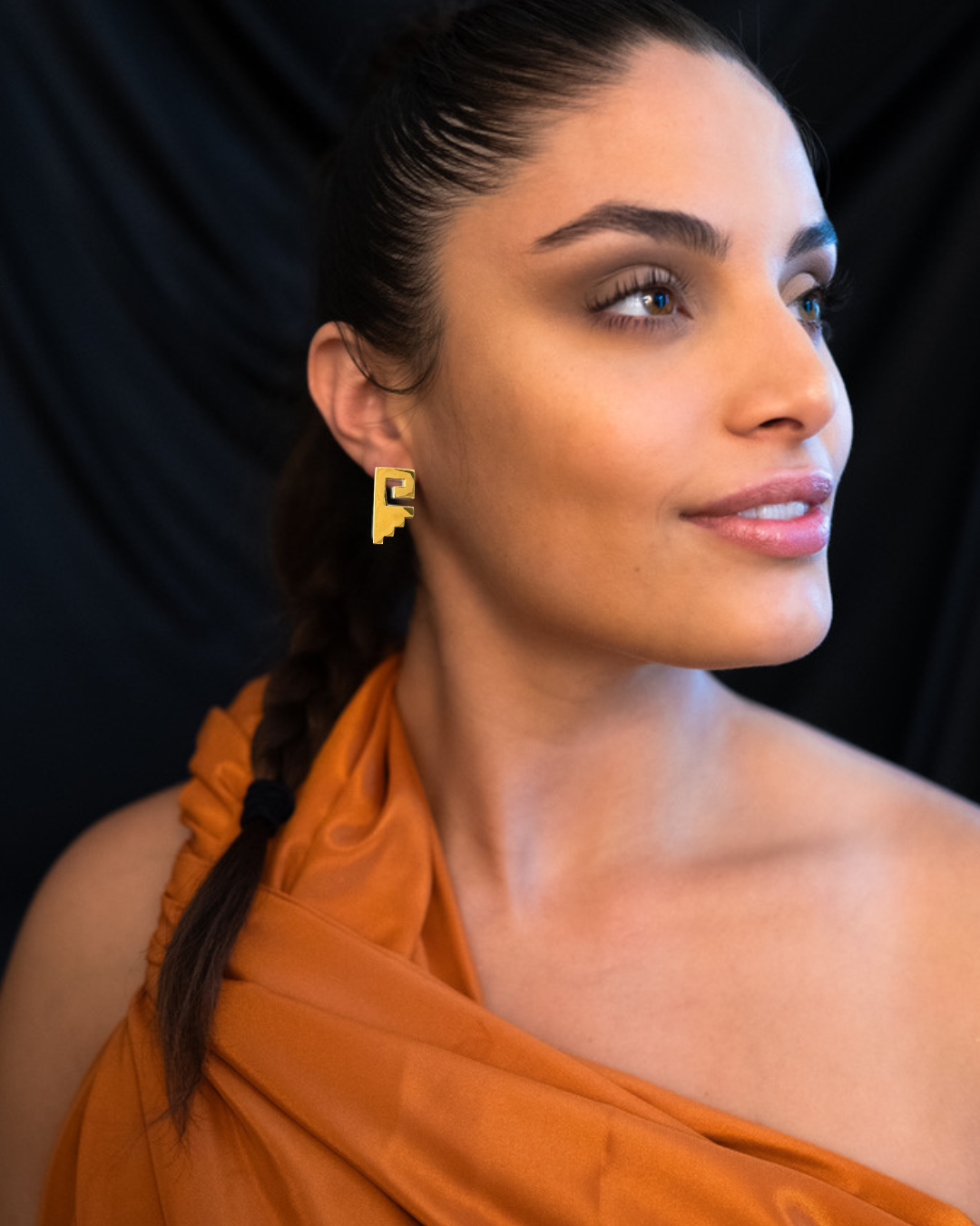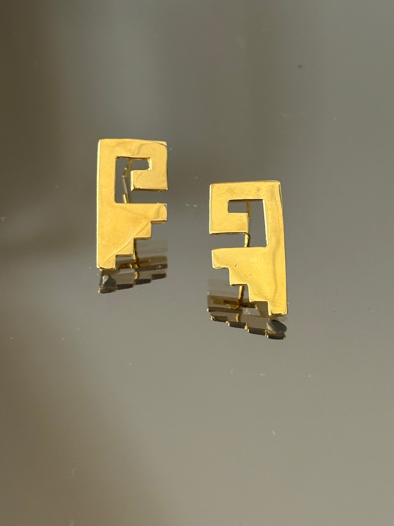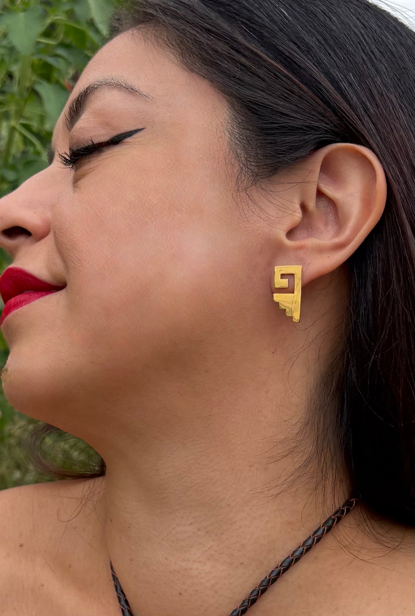 The Mitla Earrings are hand crafted in bronze and coated with a thick layer of 24k gold. They come in a petite size and finished as stud earrings.