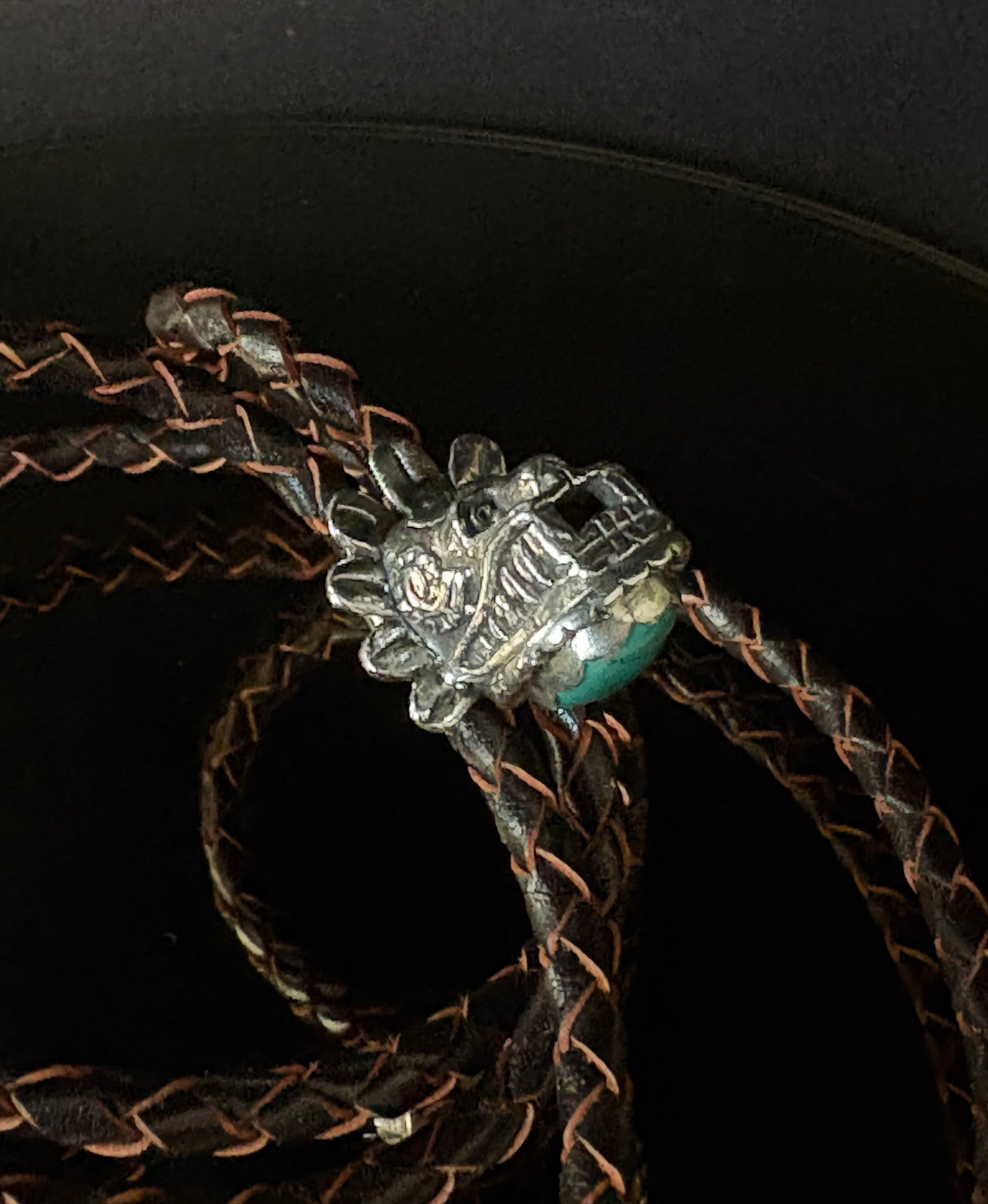 Quetzalcoatl Bolo Tie. Spectacular bolo tie featuring a sterling silver, hand made Quetzalcoatl head piece. Embellished with a hidden gem; an oval turquoise stone that brings a nice detail of color to this unique bolo tie. Finished with steel bullet tips.