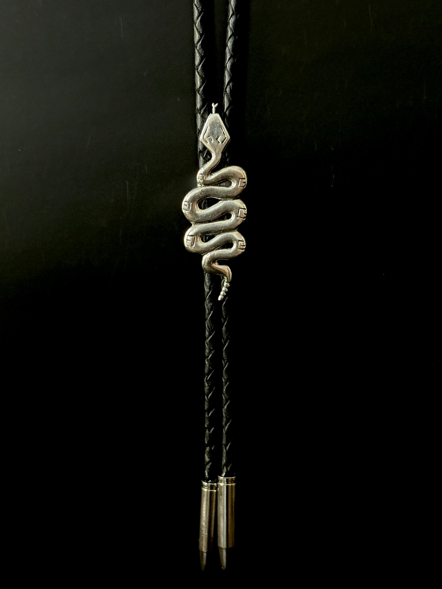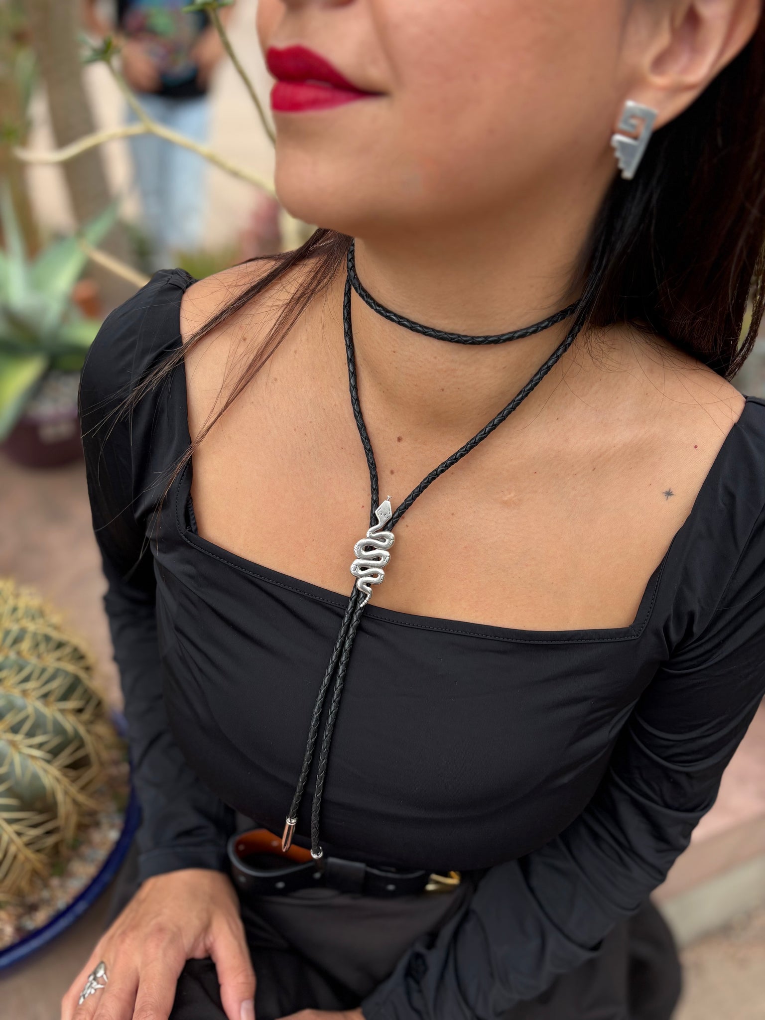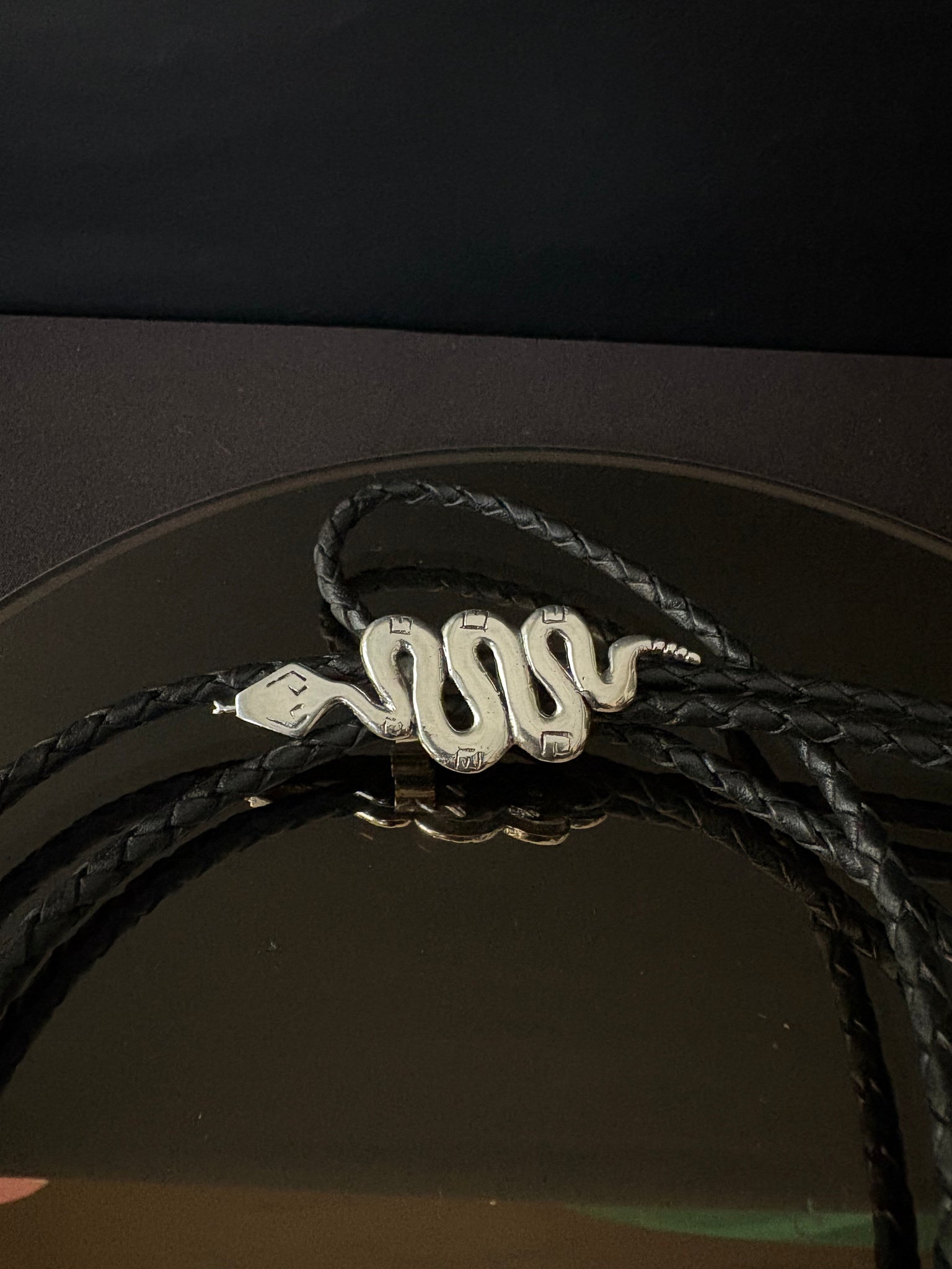 Rising Serpent Bolo Tie. This piece is an expansion of our rising serpent design. This time made into an spectacular bolo tie where the silver serpent climes up authentic black natural dyed leather cords.